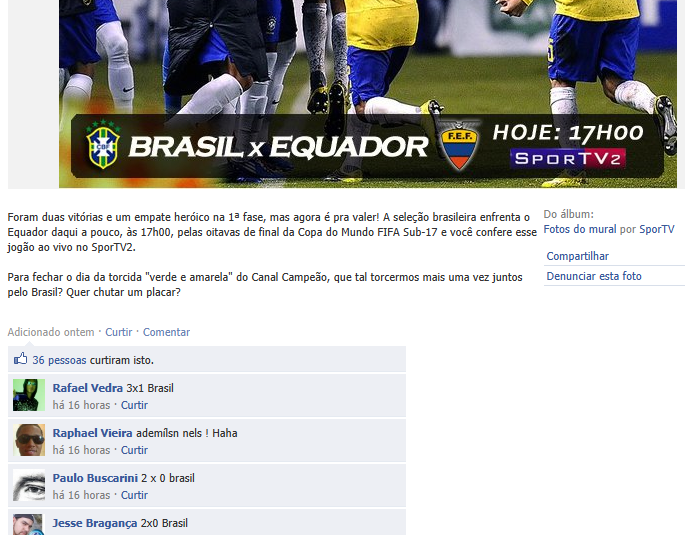 O apelo visual contribui, e muito, para que usuários compartilhem, curtam e comentem um conteúdo. O canal SporTV tem o costume de fazer montagens da principal atração que será transmitida em um dia. Ao invés de simplesmente escrever no Mural, o trabalho de criação visual é recompensado com um bom retorno de seus fãs: