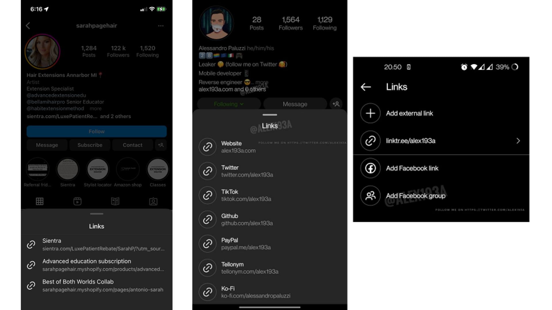 Alguns influenciadores mostraram como a nova opção de link múltiplo funciona na prática. Por enquanto, a seção destinada aos links no perfil não mudou, exceto pela adição do indicador “e 2 outros” ao lado do link principal, indicando ao usuário a existência de múltiplos domínios.