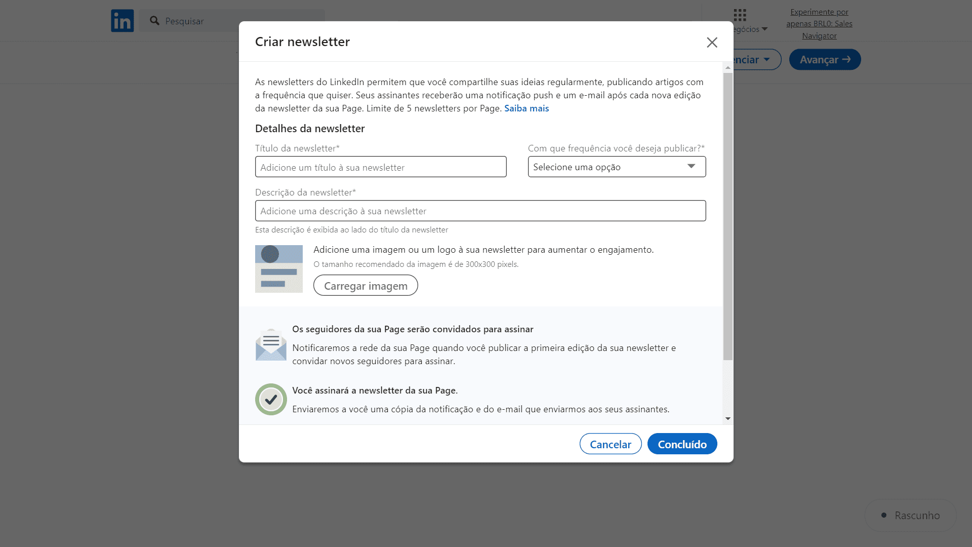 - Crie um layout e carregue uma foto de capa diferente para cada artigo da sua newsletter (recomendação: 744 x 400 pixels, segundo o LinkedIn).