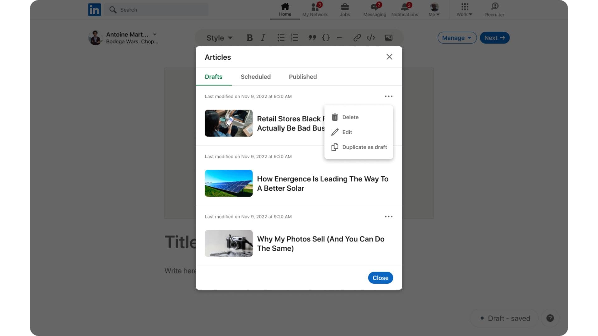 Os novos “rascunhos duplicados” do LinkedIn vão permitir que os criadores tornem seu processo de criação mais simples, replicando formatos de newsletters anteriores. Dessa forma, ao invés de criar uma newsletter do zero, os usuários podem usar um exemplo anterior como formato, o que também pode facilitar na consistência do formato.