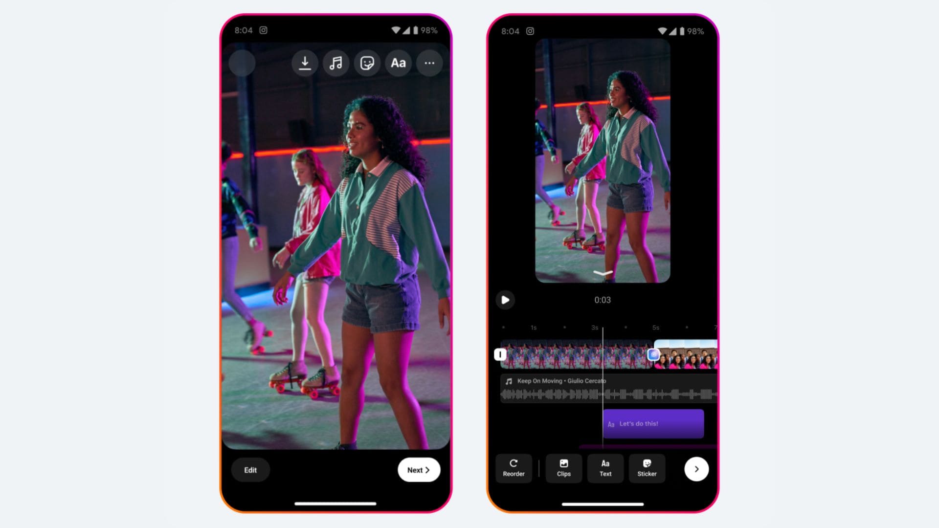 Agora, a Meta está facilitando a edição com uma tela unificada que reúne cortes e clipes, áudio, adesivos e texto, muito parecido com alguns aplicativos de edição que os usuários já costumam utilizar.