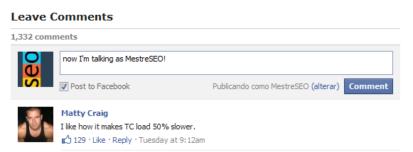 Pois é, essa idéia se extendeu ao mundo. Numa sacada interessante, o Facebook agora permite que você escolha no plugin qual o “usuário” que irá deixar o comentário no site que você está visitando. Ou seja, tomando como exemplo meu caso, eu posso escolher se desejo comentar como Ique Muniz ou Agência Mestre, uma vez que sou administrador de nossa fan page.