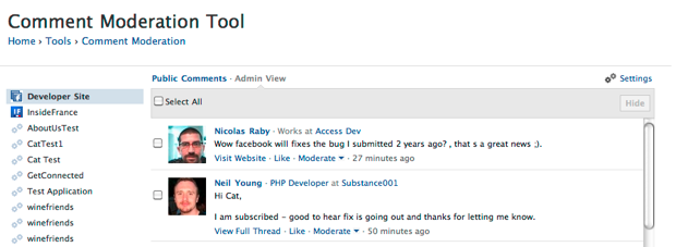 Como qualquer sistema de comentários, a moderação está presente neste sistema do Facebook. Aos administradores, uma aba de moderação será adicionada para facilitar a vida de que tem a fan page e recebe comentários (agora externos e internos).