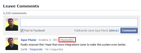 Um ponto interessante a se observar é a divulgação da fan page. Se no campo tradicional de comentário o link era para o website, com o plugin do Facebook, ele destaca exatamente o local de trabalho de seu perfil. Ou seja, sua empresa será destacada e, consequentemente, o link para a fan page estará visível.