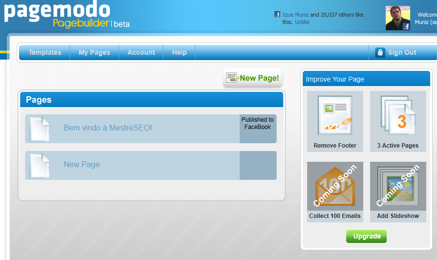 Apresento a vocês uma solução rápida, prática e eficiente neste processo: o Pagemodo. Este criador de páginas oferece diversas saídas para você que deseja criar uma fan page de forma simples. Assim como um criador de website, o Pagemodo te dá modelos prontos de páginas para você escolher e, posteriormente, customizar cada canto da mesma com fotos, textos e até vídeo.
