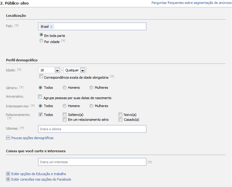 A segmentação dos Ads do Facebook se dividem em três pontos: Localização, Perfil demográfico e Coisas que você curte / interesses. Quanto mais campos preenchidos, melhor será a precisão do seu anúncio.