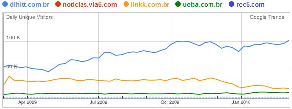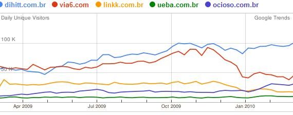 O Via6 como um todo, de fato, tem expressividade, somando seus serviços como Indica6, Blog6 e tudo o mais. Curiosamente, o Ocioso com todo esse potencial a mais em volume de notícias e cliques em notícias, acaba tendo menor volume de visitas do que o diHiTT – muito menor.