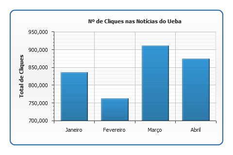 O Uêba teve, em abril, quase a mesma quantidade de notícias de março (1080), totalizando 1030 notícias ao longo do mês. As notícias sobre imagens diversas continuam figurando entre as mais clicadas na rede, misturadas a outras de temas diversos também. Além de menos notícias, menos cliques também aconteceram, o que pode ser conferido no gráfico mais abaixo neste artigo.