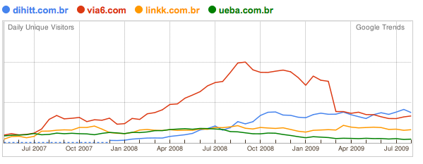 Para analisar o tráfego das redes sociais estudadas, utilizamos duas ferramentas, o Google Trends e o Compete.com. Com base nelas pudemos notar que o diHiTT e o Uêba são redes sociais com uma boa quantidade de tráfego. Segundo o Compete.com, o Uêba lidera o mercado, seguido do diHiTT. Já no Google Trends, a liderança fica por conta do diHiTT, seguido do via6.com. Um ponto importante no gráfico de ambas as estimativas é que utilizamos o domínio do via.com e não o subdomínio, sendo assim, a quantidade de tráfego do rec6.via.com ainda é bem menor.