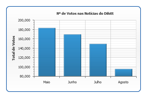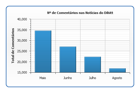 Agosto não foi um mês de sucesso para o diHiTT. Apesar do novo layout ter sido lançado e da alteração de detalhes da dinâmica da rede, o volume de notícias que foram populares em agosto caiu em mais de 1.000 notícias, ficando com um total de 1.781 notícias ao longo de todo o mês. A queda de cerca de 30% no volume de notícias populares refletiu diretamente o volume de votos (cerca de 30% menos) e de comentários, que ficou próximo dos 25%.