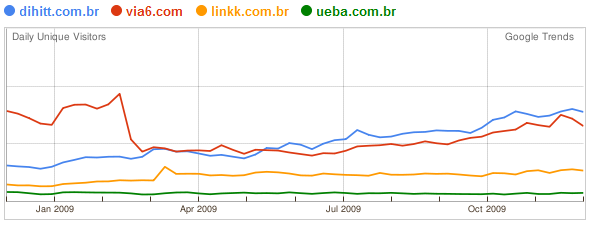 Analisando os dados do Google Insights com relação ao mês de Dezembro, podemos notar uma excelente evolução do diHiTT e do via6.com (rede que o Rec6 faz parte). Ambas as redes estão com um bom crescimento de visitas, chegando bem próximas ao patamar atingido pelo via6.com no começo do ano de 2009. Um dado interessante para a nossa análise é que ao realizar comparações com outros websites que gerenciamos, estimamos que o diHiTT tenha algo em torno de 150.000 visitas diárias, o que é um excelente número para uma rede “digg-like” brasileira.