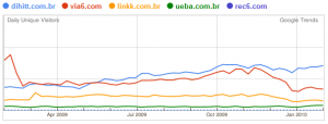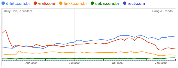 No comportamento geral da tendência de visita nos sites, nota-se que o diHiTT continua em ascenção; o Via6 realmente em queda, enquanto o Rec6.com ainda não figura entre os concorrentes; LinkK constante; e o Uêba em uma ligeira alta de tendência de visitas: