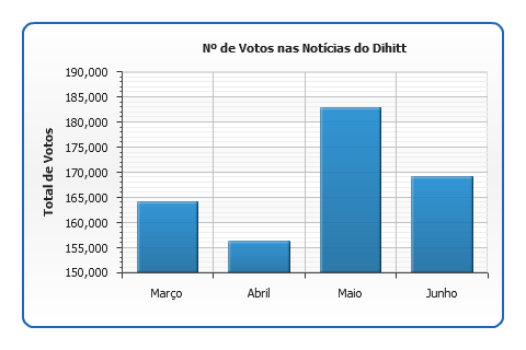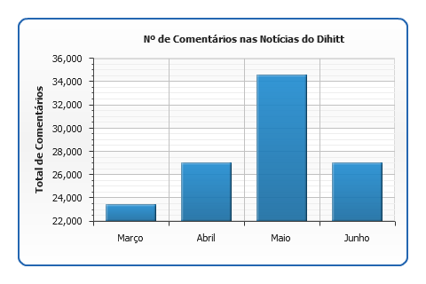 Em junho, o diHiTT manteve seu crescimento em volume de notícias de entrada atingindo 2.802 notícias, superando maio (2.449) em cerca de 350 notícias. A quantidade de votos nessas notícias, por outro lado, diminuiu: os 183 mil votos de maio caíram para cerca de 169 mil, talvez pela maior rotatividade de notícias, fazendo com que elas tenham menos tempo para receber votos, já que haviam mais opções.