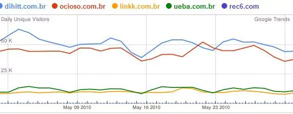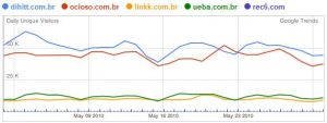 Olhando mais de perto somente o mês de maio (últimos 30 dias disponíveis na ferramenta na data desta postagem), é possível observar que o Ocioso superou o diHiTT em visitas em um dia e que os sites estão com volume de visitas muito próximos, bem como Linkk e Uêba entre si: