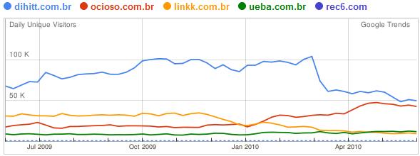 Na evolução de visitas de todas as redes acompanhadas, existe uma leve tendência de queda para diHiTT e Ocioso, enquanto Linkk e Uêba estão praticamente constantes no volume de visitas desde março, e o Rec6 nem sequer aparece: