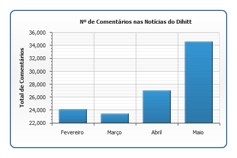 Maio foi um mês mais produtivo para o Dihitt: com 2.449 notícias diferentes em sua página inicial, superou abril (1.457) em quase 1.000 notícias a mais. Isso dá a rede social uma média de 79 notícias por dia, uma marca muito superior a sua média geral de 49 notícias por dia ao longo do mês. Teria o Pablo Melo se movimentado por lá para agitar o diHiTT, ou foram os próprios usuários que ficaram mais ativos em maio? Seja qual for o motivo, o avanço faz muito bem para a rede. Por outro lado, os conteúdos populares por lá (notícias ou comentários) continuam sendo de cunho pessoal ou “não jornalísticas”/ informativas, por assim dizer, mas “copa” e “mundo” estiveram entre as palavras mais populares nos títulos de artigos por lá.