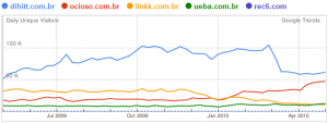O Uêba mantém uma certa estabilidade: apenas pequenos aumentos são de fato perceptíveis – em janeiro e ao longo de abril. O Rec6 nem sequer aparece nos reports do Google Trends e, como está indo de mal a pior, nem deve aparecer. Se você tem sugestões de novas redes de conteúdo que gostaria de ver por aqui, redes as quais funcionam para o seu site, não deixe de mencionar nos comentários. Até a próxima!