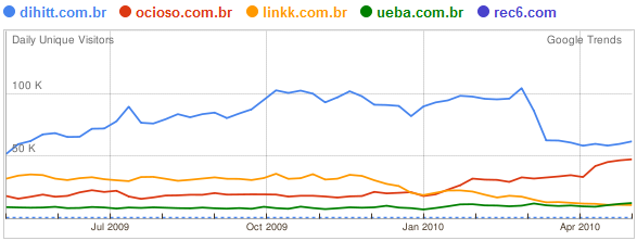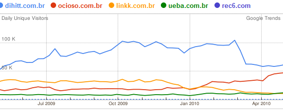 Importante notar que, em abril, Ocioso e diHiTT começam a ficar bem próximos nos volumes de visitantes, com destaque para o crescimento do Ocioso, porém, no final da curva, o diHiTT também apresenta crescimento. As duas redes devem se destacar como as mais importantes, deixando os concorrentes para trás, realmente.