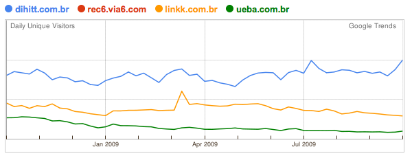 Se observarmos as redes sociais no Google Insights podemos notar que o diHitt continua o seu crescimento, enquanto o Linkk consegue um tráfego praticamente 2x maior que o Uêba. Já o Rec6 não aparece nos gráficos.