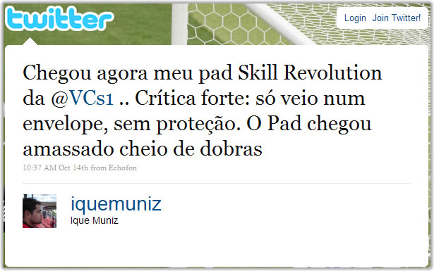 Recentemente ele comprou um mouse pad na loja online VC’s1 efetuou o pagamento e estava aguardando o envio do mesmo. Ao chegar o mouse pad, o descuido com o envio era notável pelo estado da embalagem, ou melhor, do envelope, isso mesmo enviaram o mouse pad em um envelope. Resultado? O mouse pad chegou completamente amassado e cheio de dobras, enfim estava completamente detonado. Com o acontecido o Ique twittou o seguinte: