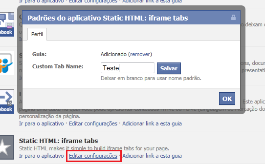 Outro questionamento bastante comum é relacionado com a alteração do nome da aba, já que todas vêm com o “Welcome” como padrão. Para tanto, basta clicar no link abaixo do título da aba (“Editar informações”), ir para o campo de Aplicativos, encontrar o Static HTML e clicar em “Editar configurações”. Escolha o nome de sua preferência, salve e retorne para sua home.
