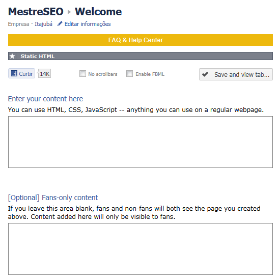 Se em nosso artigo de iFrame ensinamos uma maneira de se trabalhar, instalando praticamente um “aplicativo” para hospedar sua aba, com o Static HTML o trabalho é bem mais prático. Ao colocá-lo em uma fan page, uma aba é automaticamente postada na sua lista e, ao acessá-la, dois campos estarão disponíveis para a inserção dos códigos.