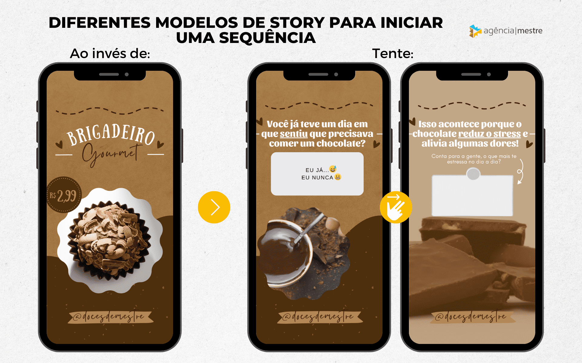 Uma boa ideia poderia ser começar com imagens dos doces e algumas palavras ou frases de impacto. Além disso, você pode utilizar as ferramentas disponíveis para iniciar uma conversa, induzindo aquele usuário a te responder e engajar com o seu perfil.