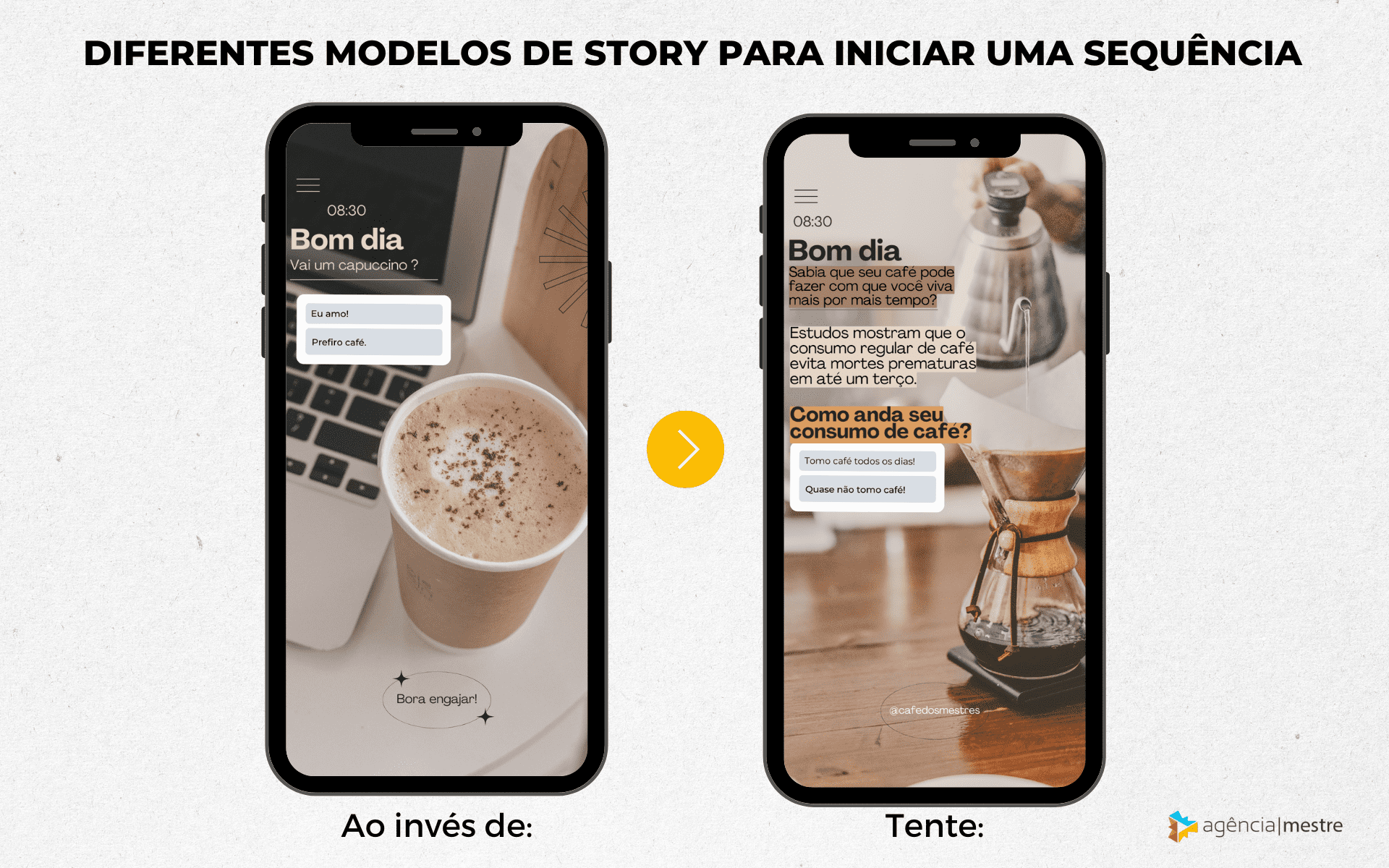 Além disso, o segundo exemplo abre espaço para que você inicie uma conversa pelos stories, faça linkagem para um artigo do seu blog, mostre possíveis outros benefícios sobre o consumo de café – antes de apresentar seu produto, que pode ser um café gourmet, por exemplo.