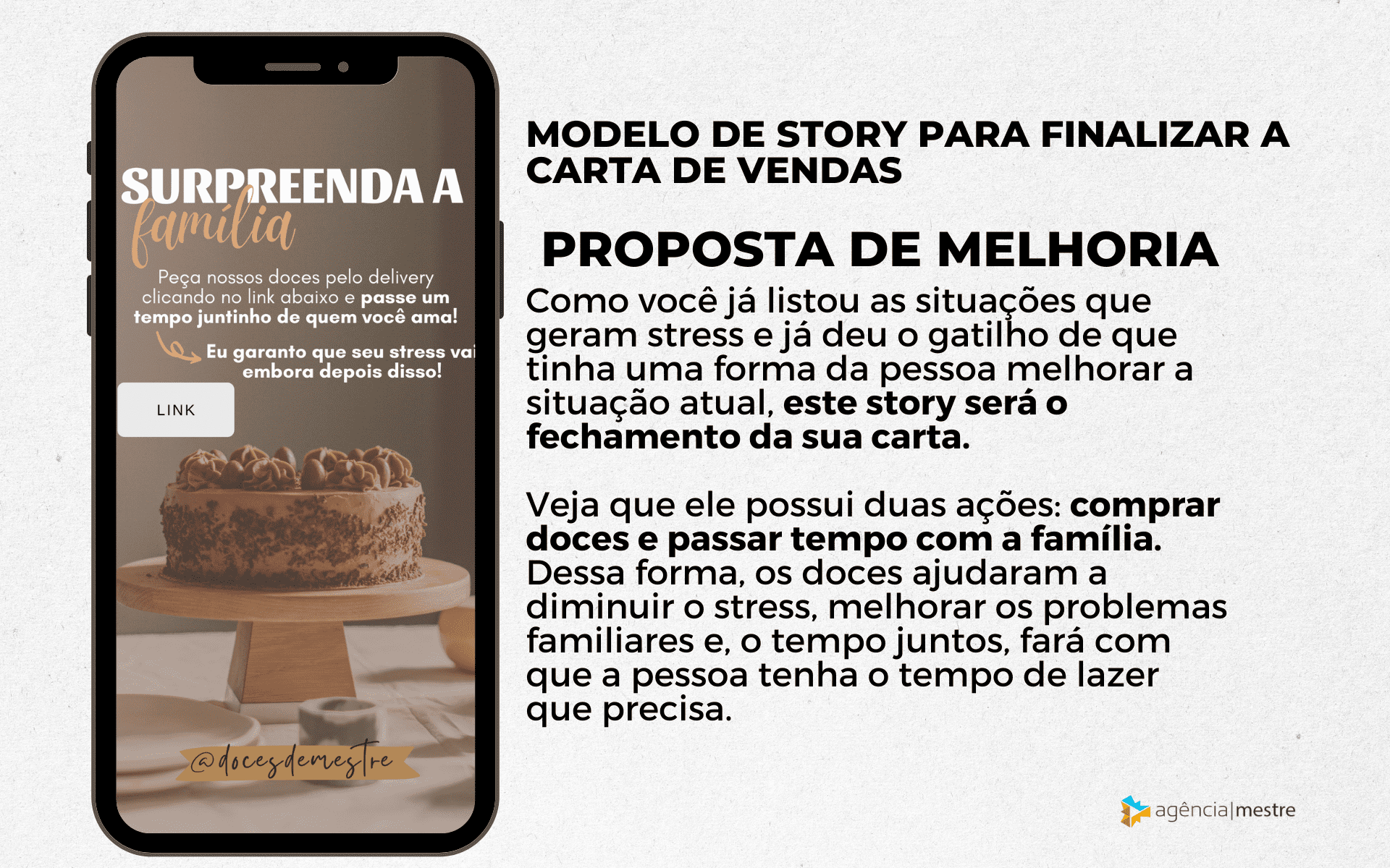 No caso do nosso delivery de doces, uma finalização interessante poderia ser um convite mais do que esperado para comprar, como nós ilustramos na imagem acima. Além da foto com o bolo ser muito atrativa, você está apresentando para a pessoa uma proposta de melhorar a relação dela com a família, diminuir o stress diário e apreciar uma guloseima saborosa, tudo isso a um clique de distância!