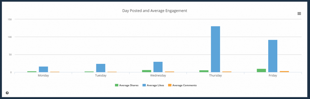 Uma avaliação que muitos gostam de fazer é analisar o melhor dia da semana. A SumoRank permite analisar o número de compartilhamentos, curtidas e comentários por dia da semana: