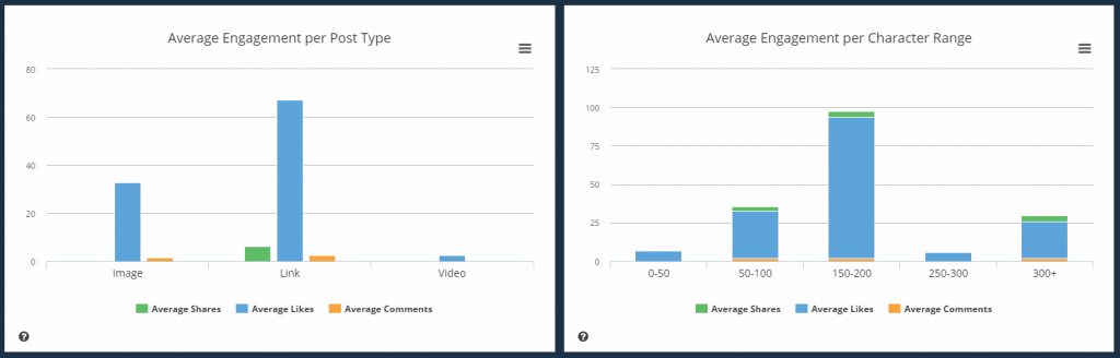 Em seguida, aparecem dois gráficos, sendo o primeiro (da esquerda) mostrando quais interações cada tipo de conteúdo possui e, o segundo gráfico, mostra a quantidade de caracteres e suas interações: