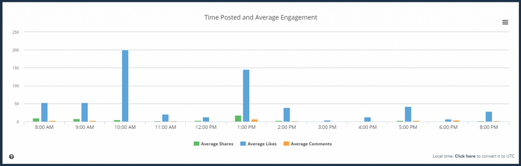 Assim como existe a avaliação de melhor dia da semana, existe a avaliação de melhores horários do dia. Aqui existe um detalhe: o gráfico vem no fuso horário UTC. Então no canto inferior direito, você pode clicar para disponibilizar o gráfico no seu horário local:
