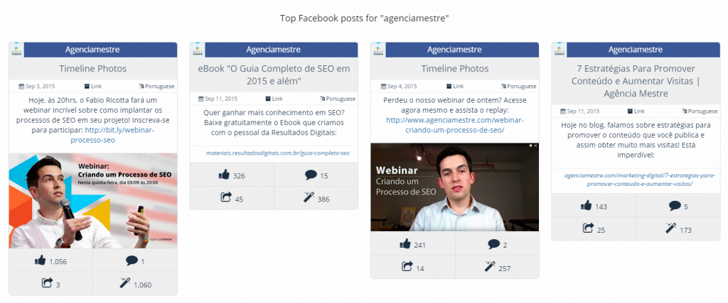 Por fim, a SumoRank mostra as 4 melhores publicações da página, facilitando você ver e entender quais interações fizeram delas as melhores da página:
