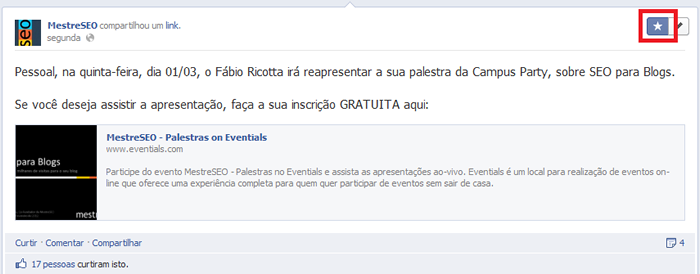 Outra novidade é o destaque de posts. Se você publica algo importante, que precisa prender mais a atenção de quem navega pela sua timeline, basta clicar na estrela no topo direito da postagem. Assim, ela será ampliada e destacada imediatamente. Uma boa alternativa.
