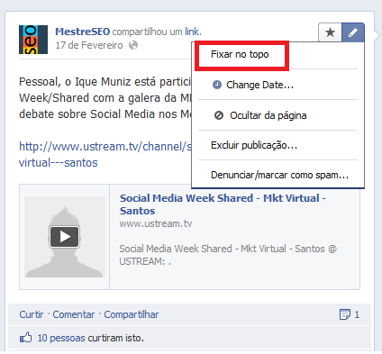 Clicando no lápis ao lado da estrela, é possível alterar algumas opções da postagem. Uma das novidades é poder fixar no topo da timeline, outra maneira de destacar uma publicação, mas sem alterar seu formato original.