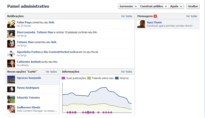 Talvez essa seja uma das mais bacanas novidades implementadas nessa timeline para fan pages. No topo direito da tela principal, existe um ícone de painel que abre todas as opções internas para que o administrador visualize o desempenho recente de sua fan page.