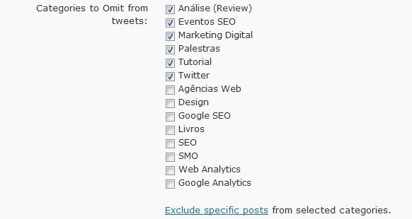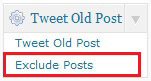 Caso você queira twittar alguma categoria que possui, infelizmente, alguns posts irrelevantes, é só mantê-la DESmarcada (como explicado acima), ou seja, ativada para publicação. Após isso, será necessário mudar na sidebar para a opção “Exclude Posts”, onde você poderá excluir os posts que você julga desnecessário Twittar.