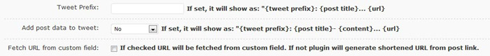 Nessa página você terá que configurar e ajustar algumas coisas. Primeiro, aconselho a remover todo e qualquer conteúdo que estiver dentro do “Tweet Prefix”. Por default, o plugin já irá inserir o título e a URL.
