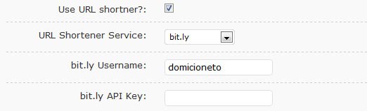 Por outro lado, você pode usar o seu próprio usuário do bit.ly ou do tinyurl para encurtar as URLs, facilitando o monitoramento dos cliques. Para tal, será necessário marcar a opção “Use URL shortner?”e inserir o usuário e, provavelmente, a chave (key) de confirmação.
