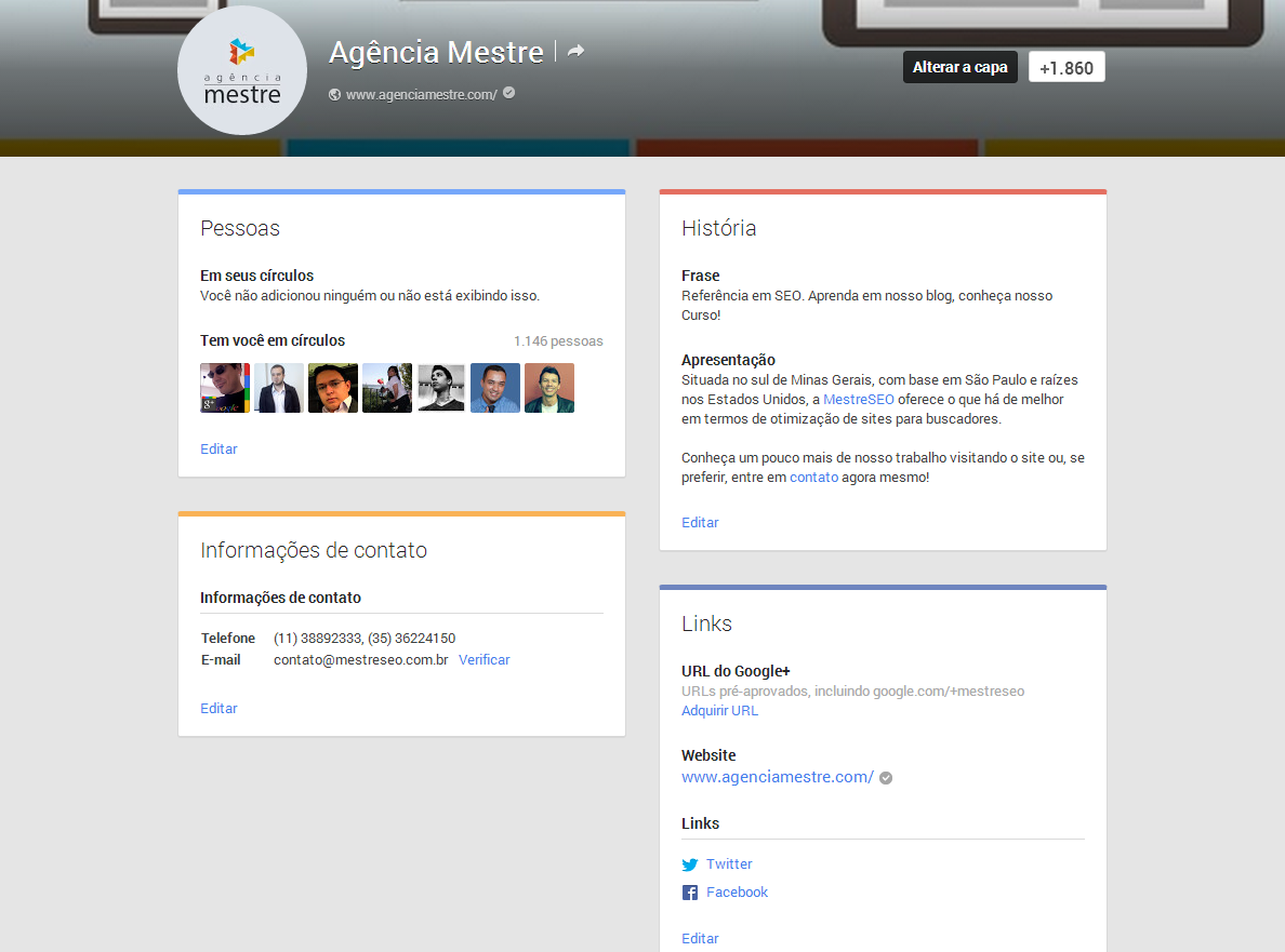 Caso você atenda os requisitos, em sua página de perfil/empresa, você enxergará um botão dizendo “Adquirir URL” na parte de “URL do Google+”: