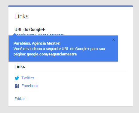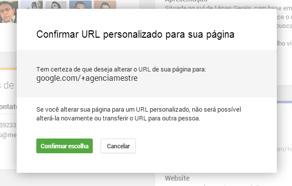 Ao possuir todos os 3 requisitos, você conseguirá visualizar um pedido do Google+ para você selecionar a sua URL Personalizada.