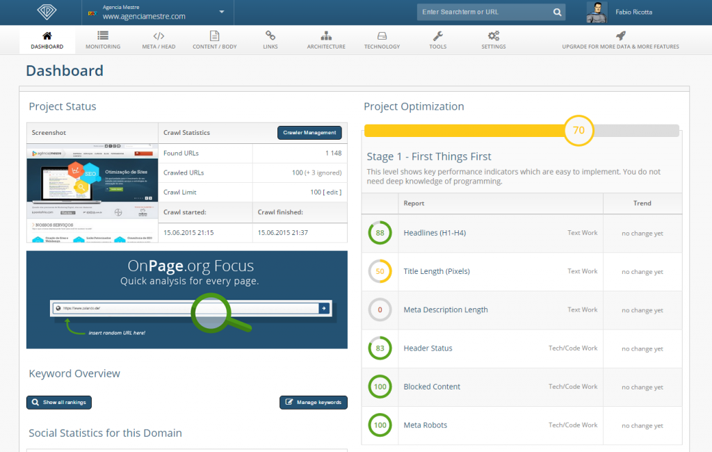 Outra ferramenta que ganhou muita popularidade junto à comunidade de SEO é o OnPage.org. Ela é gratuita para um início e muito interessante para uma pequena avaliação comercial do site como um todo. Visualmente, assim como a WooRank é muito interessante mesmo: