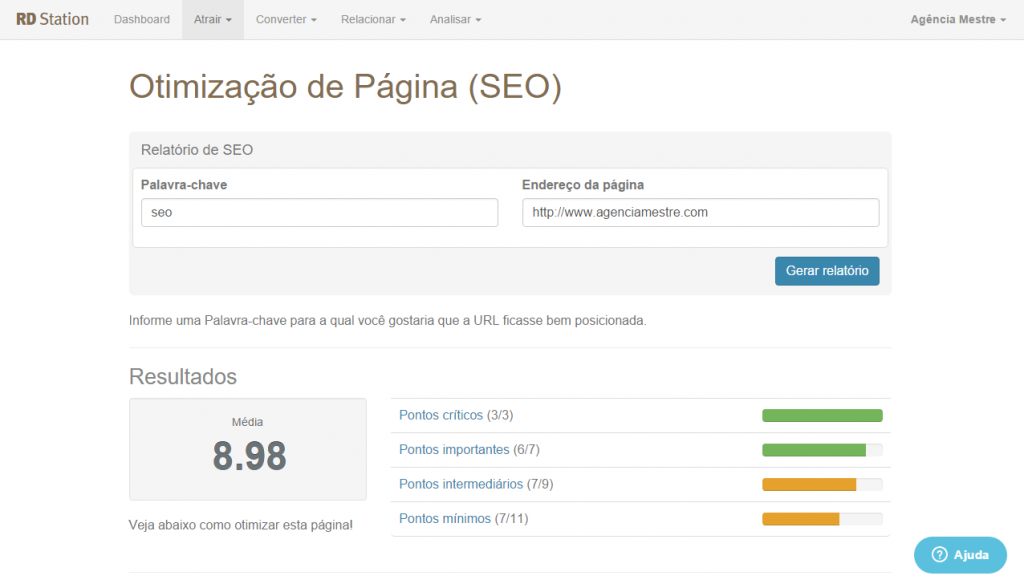 Se você possuir o RD Station em sua empresa, saiba que ele possui um módulo de SEO disponível para você, o qual faz uma avaliação muito parecida com as ferramentas acima. É uma excelente forma de entender rapidamente o que está errado em uma página: