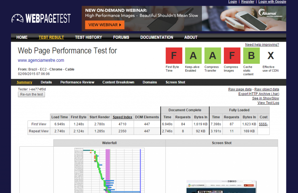 A velocidade do site também é muito importante e uma ferramenta muito boa para analisar isto é a WebPageTest.org, a qual analisa a sequencia com que uma determinada URL é carregada e assim você pode indicar rapidamente se existe algum problema grave: