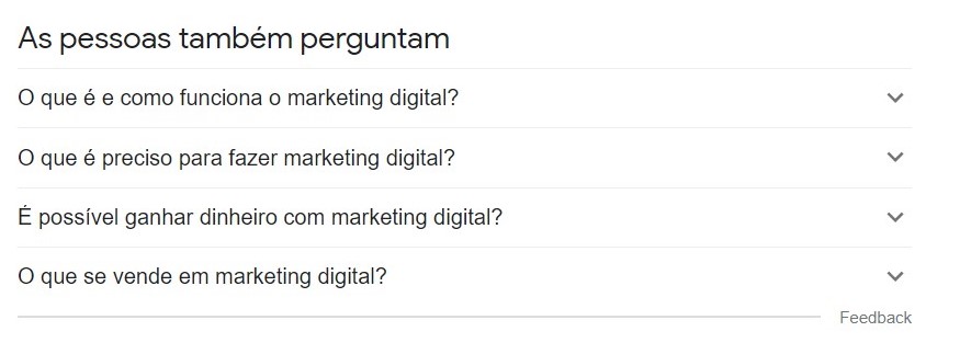 Analisar as listagens de perguntas desse recurso é uma excelente maneira de compreender a jornada do usuário ao realizar alguma pesquisa no buscador. No início, sempre haverão dúvidas mais gerais (topo de funil), à medida que os tópicos vão se expandindo, dúvidas mais específicas e complexas tomam conta das listas.