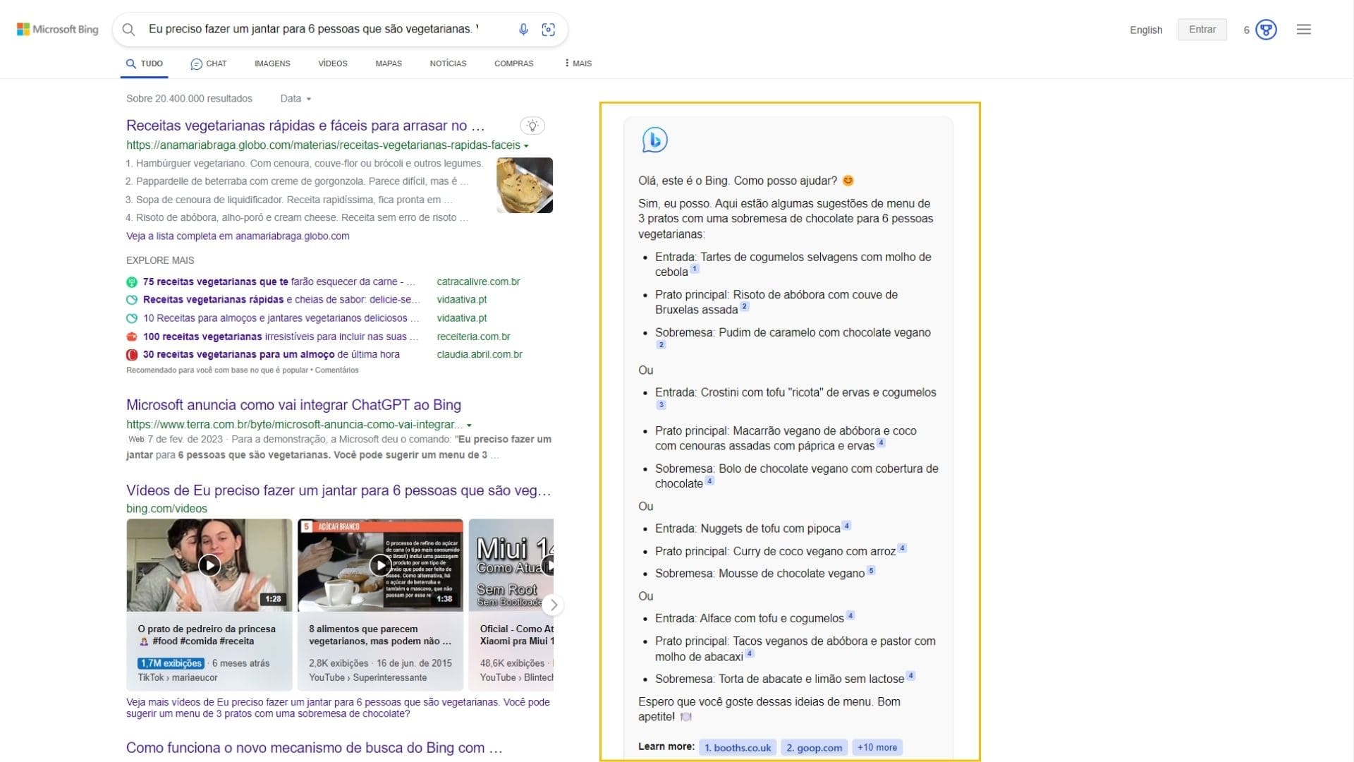 Além disso, caso o Bing decida substituir as respostas do tipo snippet em destaque pelas respostas do Bing Chat, isso poderá afetar as taxas de cliques e o tráfego orgânico para suas páginas.