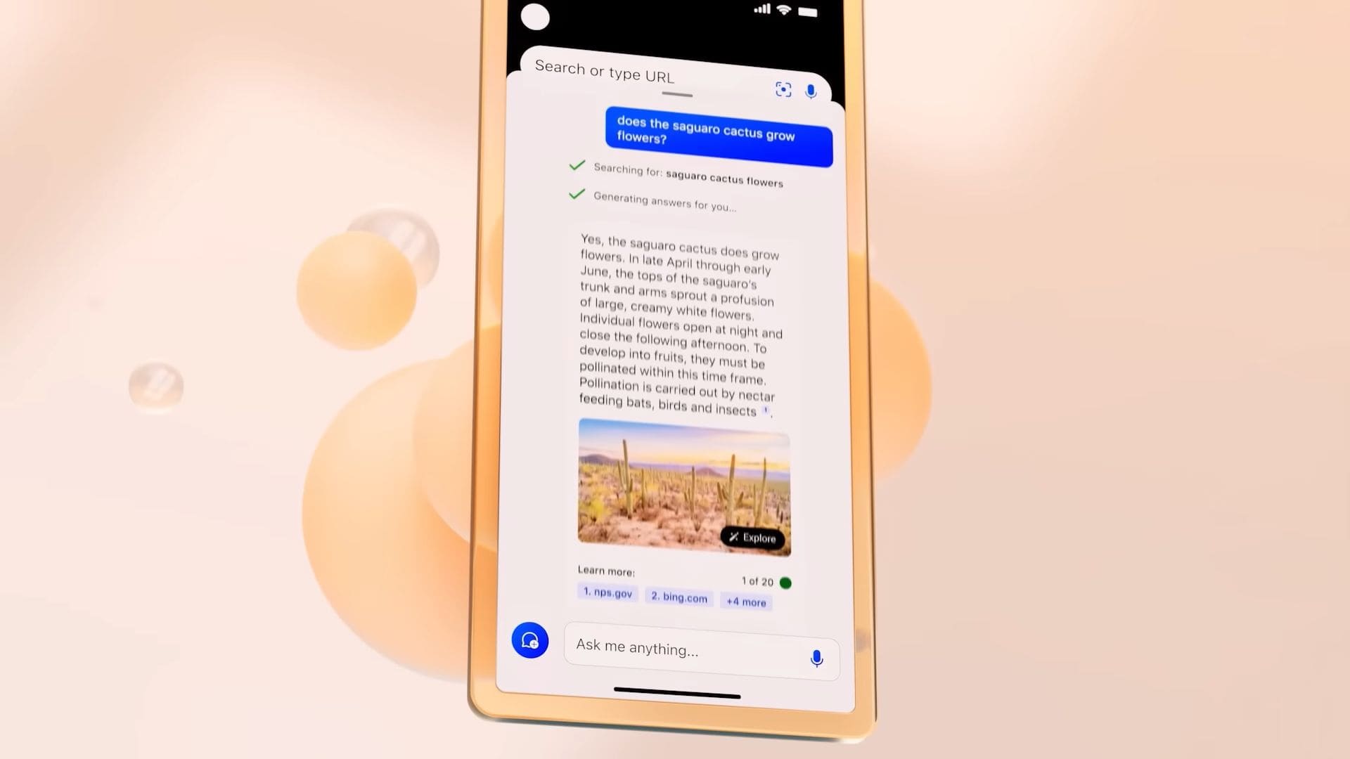 “Disponível para iOS e Android hoje, o aplicativo móvel Bing oferece uma nova aparência e experiência. Tocar no ícone do Bing na parte inferior abrirá uma sessão de bate-papo, na qual você pode interagir da mesma maneira que pode na área de trabalho.”