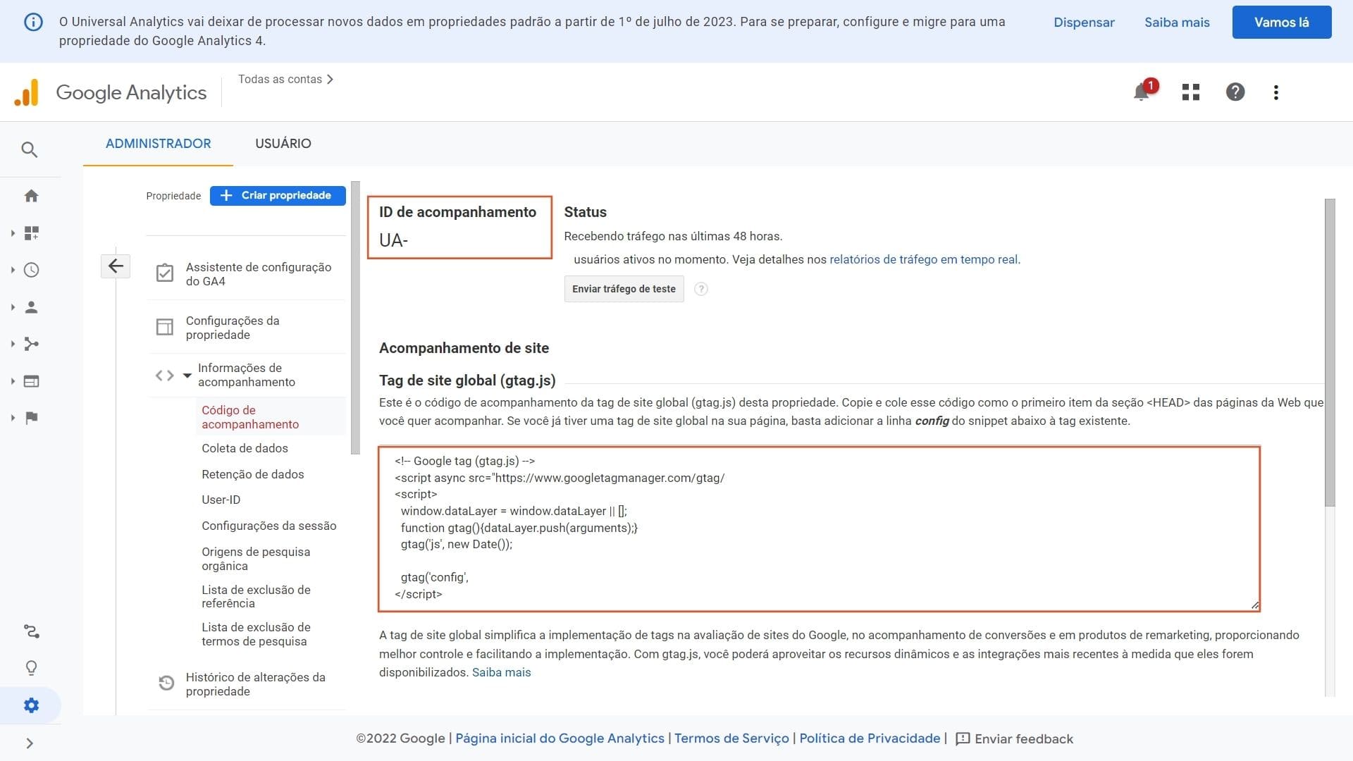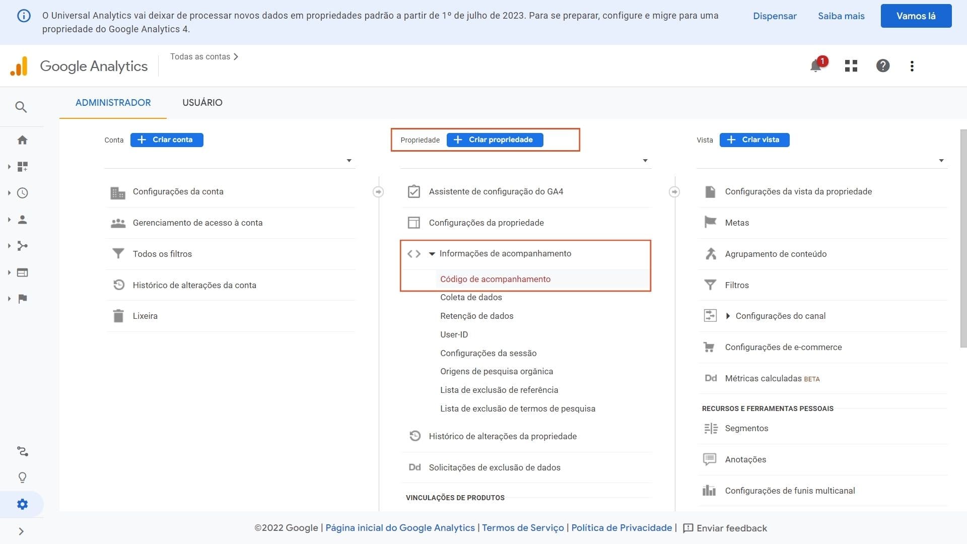 A tela será dividida em três partes: “Conta”, “Propriedade” e “Vista”. Na aba “Propriedade”, localize a opção “Informações de acompanhamento” e, em seguida, “Código de Acompanhamento”.