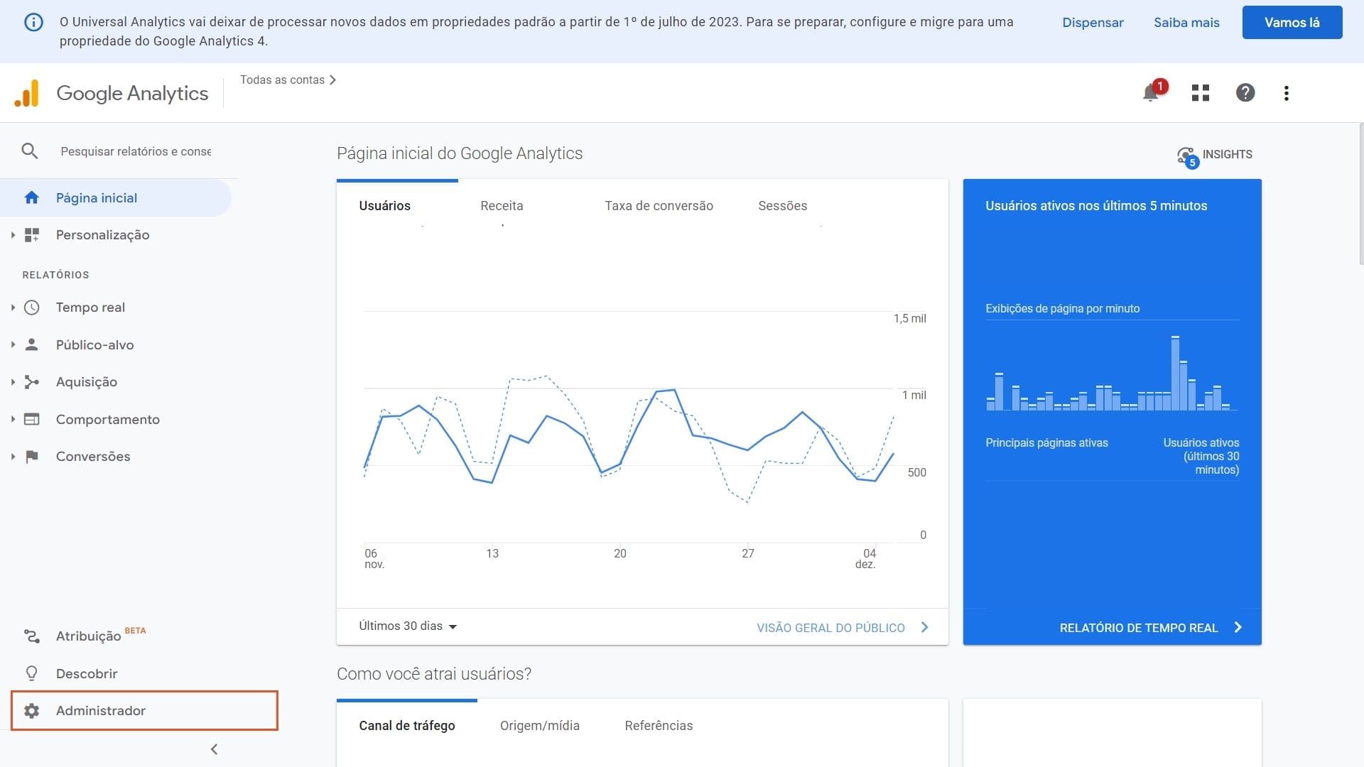 Primeiro, você deve estar logado na sua conta no Google Analytics e acessar a aba “Administrador”: