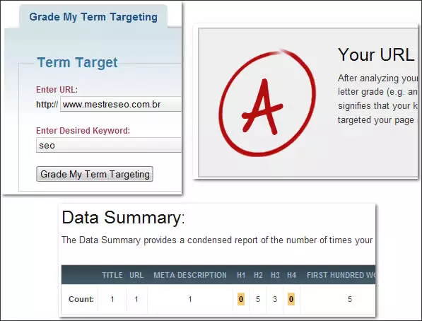 Esta ferramenta avalia o uso do termo escolhido considerando título, heading tags, negrito (tags strong ou b), description e alguns outros fatores. Com ela, você pode comparar o uso de uma palavra por vários websites (cada um de uma vez) e descobrir em quais pontos o seu website ainda pode melhorar.